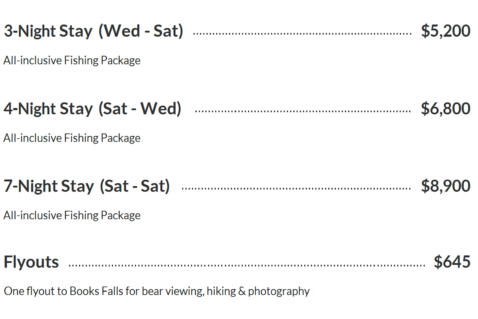 Katmai Lodge strives to provide an all-inclusive, Alaskan wildlife experience for our guests. Your package price includes: