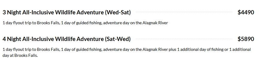 - Round trip air travel between Anchorage & Katmai Lodge is a separate charge of $695 per person